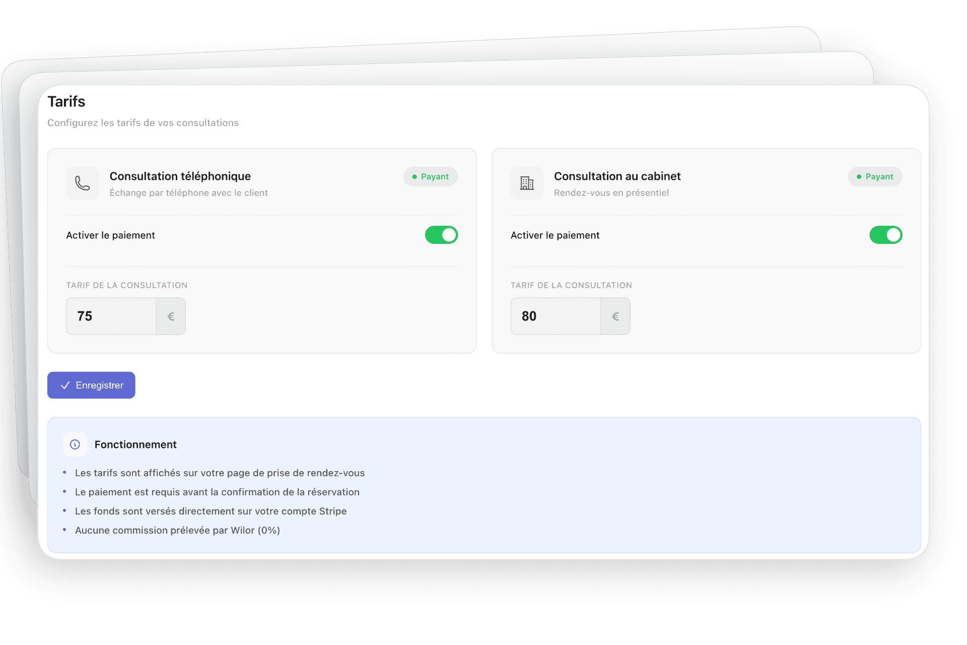 Proposez des consultations payantes via Stripe. Vos clients règlent à la réservation, vous recevez les fonds directement sur votre compte.