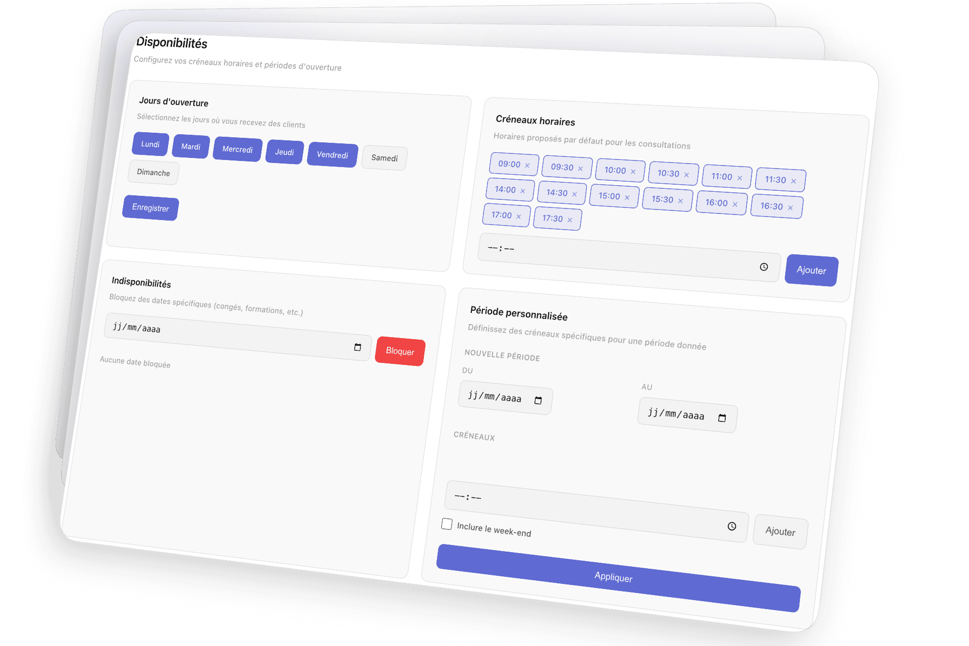 Définissez vos créneaux, bloquez vos congés et bien plus.
