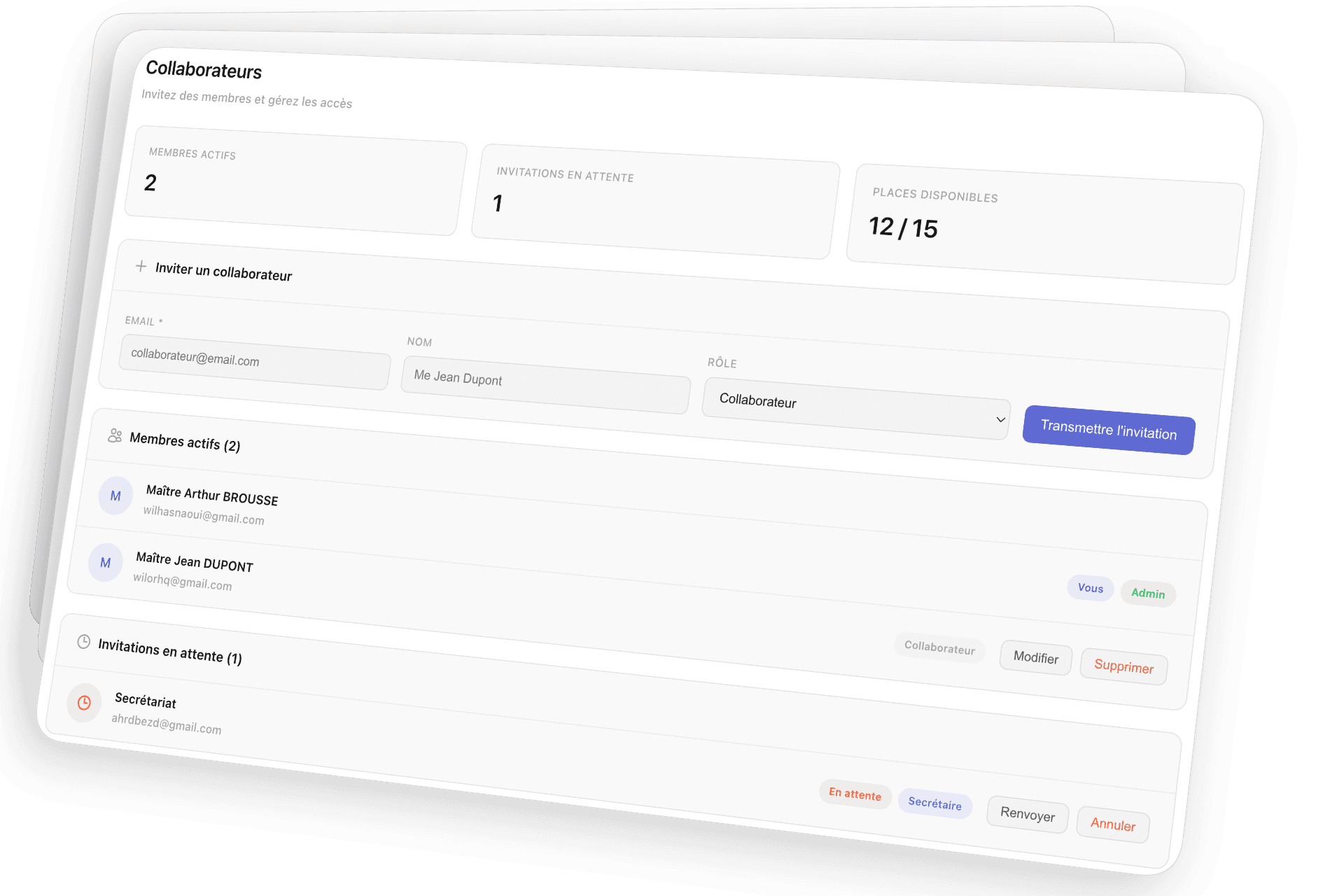 Admin, avocat, secrétaire, définissez qui peut voir et faire quoi dans l'application.